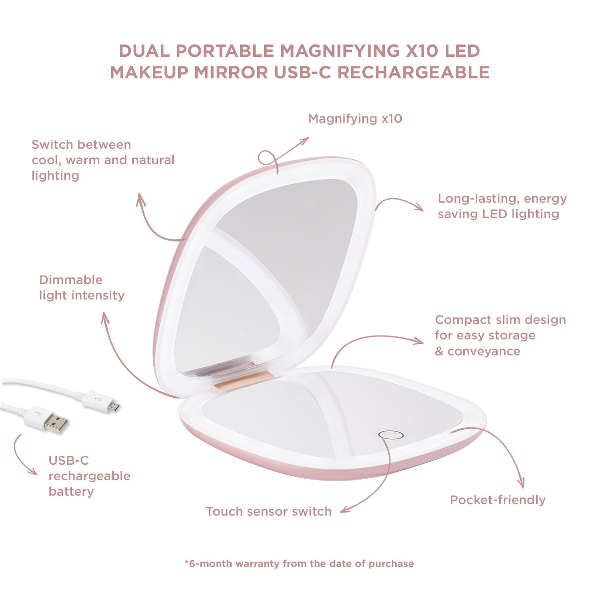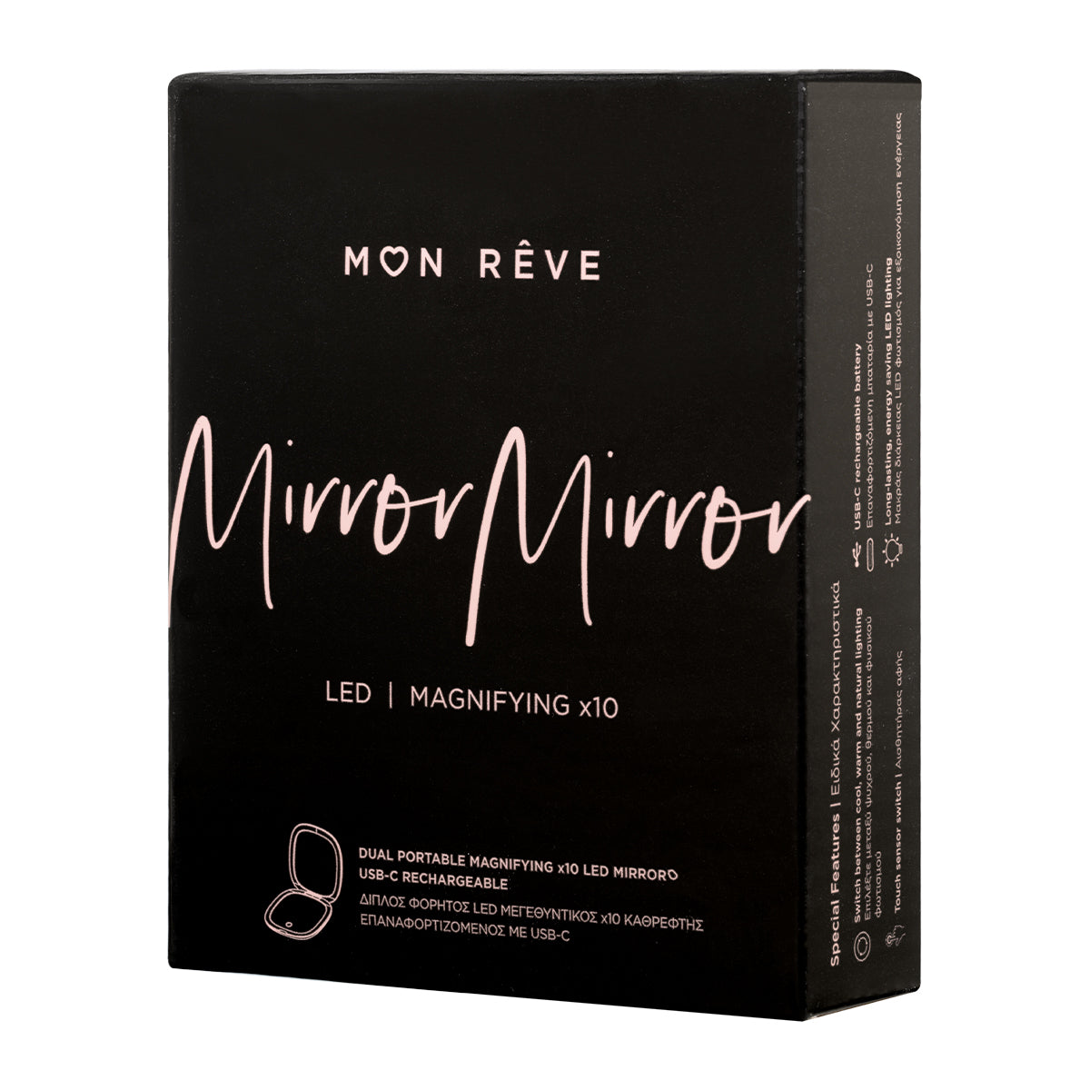 The Mirror Mirror x10, a compact dual-lighted, rechargeable, LED makeup mirror, is the all-in-one makeup gadget you need.The ideal accessory for beauty touchups, eyebrow tweezing, detailed makeup application & any other pampering need. With the touch sensor switch, you can easily turn on & off the lighting and select between cool, warm and natural light, while by long-pressing the sensor switch you can dim up or dim down the light brightness to your liking or light environment. The x10 magnification in one of the mirror’s lid “reveals” every detail you wish to vanish and create a flawless makeup look anytime, anywhere.